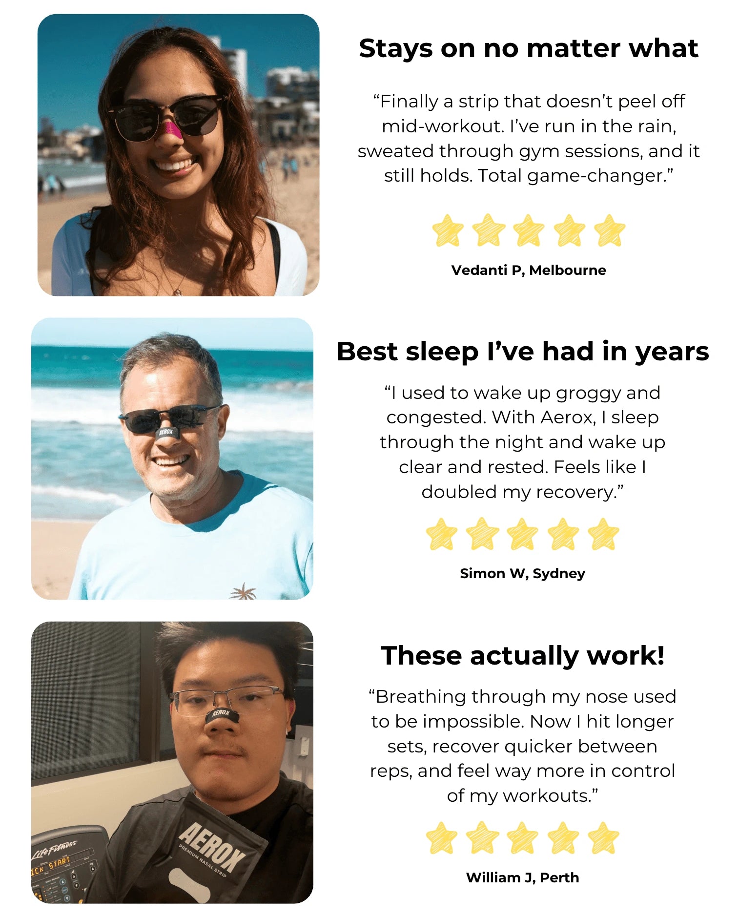 AEROX Nasal Strips mechanically widen the nasal passages, reducing airway resistance by up to 30%. This increases oxygen intake, improves breathing efficiency, and helps clear nasal congestion. Unlike the ordinary chemist strip, AEROX is designed to stay on through the night & workouts.